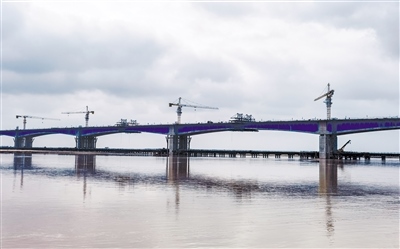 10月5日凌晨,由內蒙古高路公司投資,中交二公局承建,包茂高速公路昭君黃河特大橋主橋雙幅順利合龍。昭君黃河特大橋橫亙于黃河,氣勢宏偉,蔚為壯觀,大橋采用雙向4車道高速公路標準建設,全長4300米,分北岸灘橋、北岸跨堤橋、主橋、南岸灘橋、南岸跨堤橋五部分。(王曉博 攝)