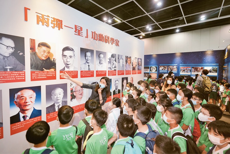 2021年6月27日至7月9日,“時(shí)代精神耀香江”之百年中國(guó)科學(xué)家主題展在香港向公眾開(kāi)放。圖為7月7日,眾多小學(xué)生仔細(xì)聆聽(tīng)講解員的介紹。中新社記者張煒/攝