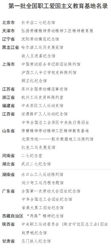 第一批全國職工愛國主義教育基地包括北京市長辛店二七紀(jì)念館、黑龍江省鐵人王進喜紀(jì)念館、上海市中國勞動組合書記部舊址陳列館、廣東省全國第一次勞動大會舊址紀(jì)念館、陜西省中央職工運動委員會(陜甘寧邊區(qū)總工會)舊址等27家單位。旨在進一步加強紅色工運資源的保護挖掘和宣傳利用,引領(lǐng)各級工會努力把紅色工運資源建設(shè)成為開展黨史學(xué)習(xí)教育的重要陣地,打造成愛國主義教育、革命傳統(tǒng)教育、加強職工思想政治引領(lǐng)的生動課堂,團結(jié)引導(dǎo)廣大職工群眾更好傳承紅色基因、賡續(xù)紅色血脈、汲取奮進力量。第一批全國職工愛國主義教育基地在中國工運史上影響重大,代表性強、知名度高,現(xiàn)有的設(shè)施建設(shè)和保護利用較好,符合時代要求,具有較強的示范引領(lǐng)作用。