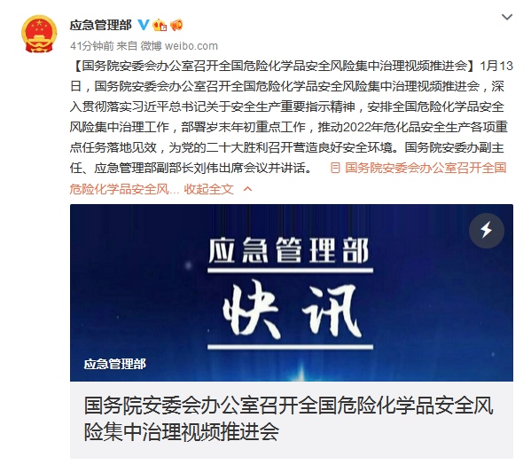 據(jù)應(yīng)急管理部官方微博消息,近日國務(wù)院安委會辦公室召開全國危險化學(xué)品安全風(fēng)險集中治理視頻推進(jìn)會,會議明確指出要保持高度警覺,加強(qiáng)監(jiān)督檢查和明查暗訪,落實各項安全防范措施,嚴(yán)格領(lǐng)導(dǎo)帶班和值班值守,切實抓好歲末年初?;钒踩a(chǎn)工作,堅決防范各類事故發(fā)生。