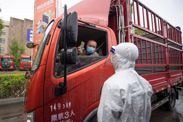 4月13日,工作人員查驗駛?cè)牒贾輦骰犯鄣呢涇囁緳C健康碼。新華社記者江漢攝