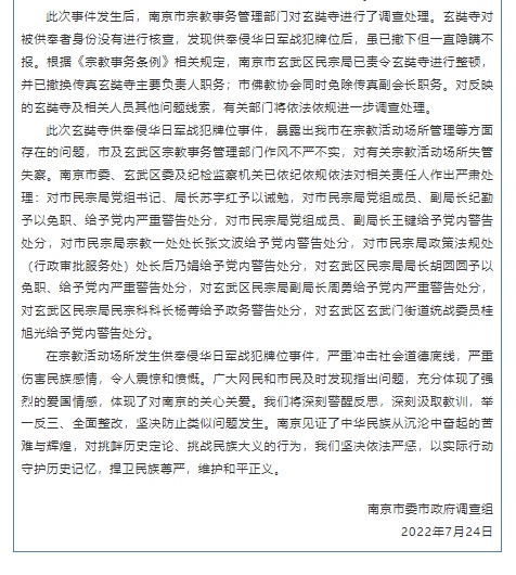 此次玄奘寺供奉侵華日軍戰(zhàn)犯牌位事件,暴露出我市在宗教活動(dòng)場(chǎng)所管理等方面存在的問(wèn)題,市及玄武區(qū)宗教事務(wù)管理部門作風(fēng)不嚴(yán)不實(shí),對(duì)有關(guān)宗教活動(dòng)場(chǎng)所失管失察。南京市委、玄武區(qū)委及紀(jì)檢監(jiān)察機(jī)關(guān)已依紀(jì)依規(guī)依法對(duì)相關(guān)責(zé)任人作出嚴(yán)肅處理:對(duì)市民宗局黨組書記、局長(zhǎng)蘇宇紅予以誡勉,對(duì)市民宗局黨組成員、副局長(zhǎng)紀(jì)勤予以免職、給予黨內(nèi)嚴(yán)重警告處分,對(duì)市民宗局黨組成員、副局長(zhǎng)王鍵給予黨內(nèi)警告處分,對(duì)市民宗局宗教一處處長(zhǎng)張文波給予黨內(nèi)警告處分,對(duì)市民宗局政策法規(guī)處(行政審批服務(wù)處)處長(zhǎng)后乃娟給予黨內(nèi)警告處分,對(duì)玄武區(qū)民宗局局長(zhǎng)胡圓圓予以免職、給予黨內(nèi)嚴(yán)重警告處分,對(duì)玄武區(qū)民宗局副局長(zhǎng)周勇給予黨內(nèi)嚴(yán)重警告處分,對(duì)玄武區(qū)民宗局民宗科科長(zhǎng)楊菁給予政務(wù)警告處分,對(duì)玄武區(qū)玄武門街道統(tǒng)戰(zhàn)委員桂旭光給予黨內(nèi)警告處分。