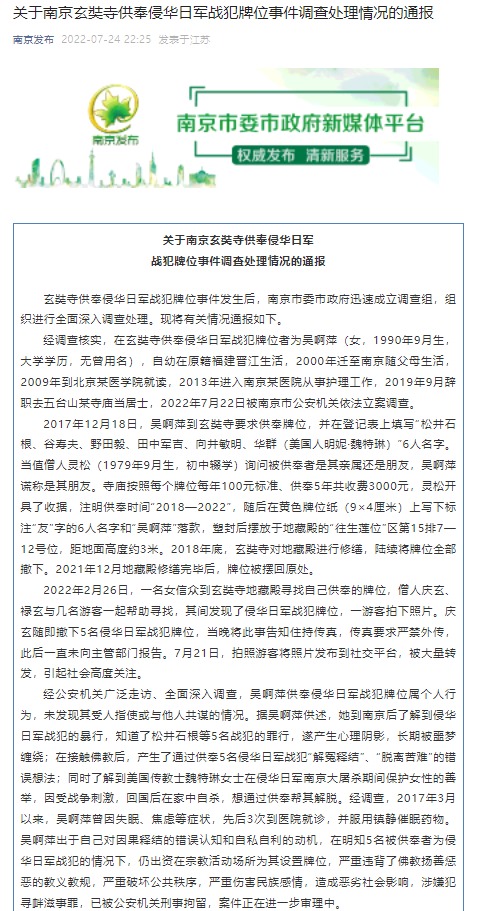 經(jīng)調(diào)查核實(shí),在玄奘寺供奉侵華日軍戰(zhàn)犯牌位者為吳啊萍(女,1990年9月生,大學(xué)學(xué)歷,無(wú)曾用名),自幼在原籍福建晉江生活,2000年遷至南京隨父母生活,2009年到北京某醫(yī)學(xué)院就讀,2013年進(jìn)入南京某醫(yī)院從事護(hù)理工作,2019年9月辭職去五臺(tái)山某寺廟當(dāng)居士,2022年7月22日被南京市公安機(jī)關(guān)依法立案調(diào)查。