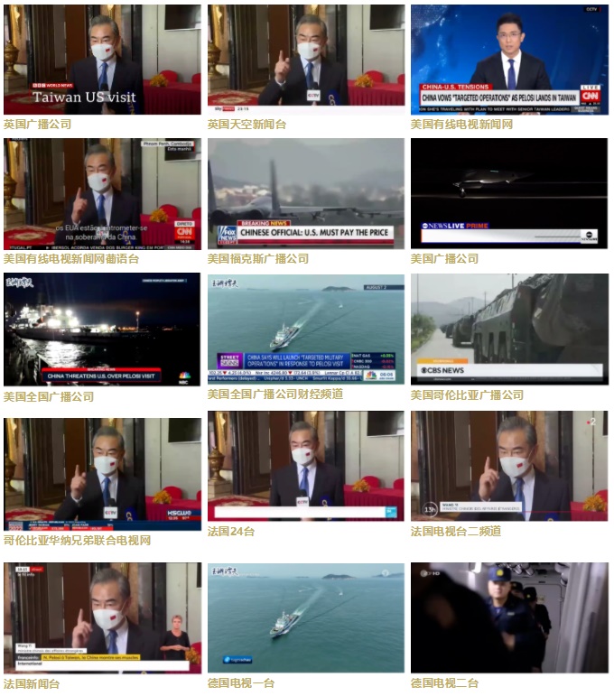 總臺國際視頻通訊社聚焦外交部、國臺辦、東部戰(zhàn)區(qū)等權(quán)威表態(tài),可視化制作編發(fā)《國際銳評》《玉淵譚天》等相關(guān)評論言論。截至8月4日10時(shí),共有84條新聞素材得到BBC、CNN、CNBC、英國天空新聞臺、法國24臺、法國電視臺、法國新聞臺、德國電視一臺、德國電視二臺、德國之聲、意大利廣播電視公司、意大利TGCOM24電視臺、加拿大廣播公司、加拿大最大的商業(yè)電視網(wǎng)CTV、俄羅斯第一頻道、全俄國家電視廣播公司、日本NHK、韓國KBS、巴西環(huán)球電視臺、印度國家電視臺、新加坡亞洲新聞臺、澳大利亞廣播公司、卡塔爾半島電視臺、墨西哥阿茲特克電視臺、印尼國家廣播電視臺等102個(gè)國家和地區(qū)的1683個(gè)電視臺及新媒體平臺采用。國際視頻通訊社還特別面向中國臺灣地區(qū)的媒體進(jìn)行精準(zhǔn)投送,實(shí)現(xiàn)臺灣地區(qū)主流電視臺全覆蓋,落地效果突出:臺灣東森電視臺、臺灣無線衛(wèi)星電視臺(TVBS)、臺灣中華電視臺、臺灣中天電視臺等共有13個(gè)臺灣電視臺及采用播出744次,播出總時(shí)長3小時(shí)26分44秒。