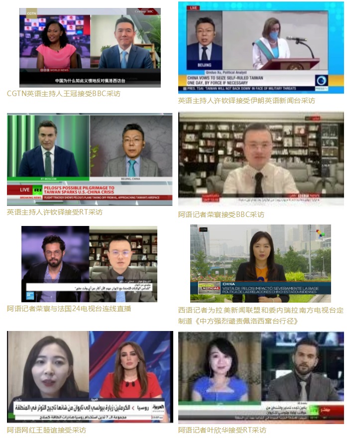 CGTN英、西、法、阿、俄等多語種主播、評論員和網(wǎng)紅積極在多家外媒發(fā)聲,接受了包括英國廣播公司(BBC)、今日俄羅斯(RT)、伊朗英語新聞臺(Press TV)、拉美新聞聯(lián)盟、貝寧E-TELE電視臺、法國24電視臺、沙特阿拉比亞電視臺以及以色列i24news電視臺等多家國際媒體的采訪連線,主動闡釋中方立場,分析佩洛西這一挑釁行徑背后的虛偽動因,揭批美國在臺灣問題上“說一套做一套”、侵犯中國的主權(quán)和領(lǐng)土完整的行為。