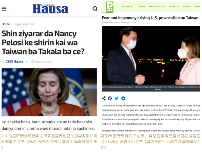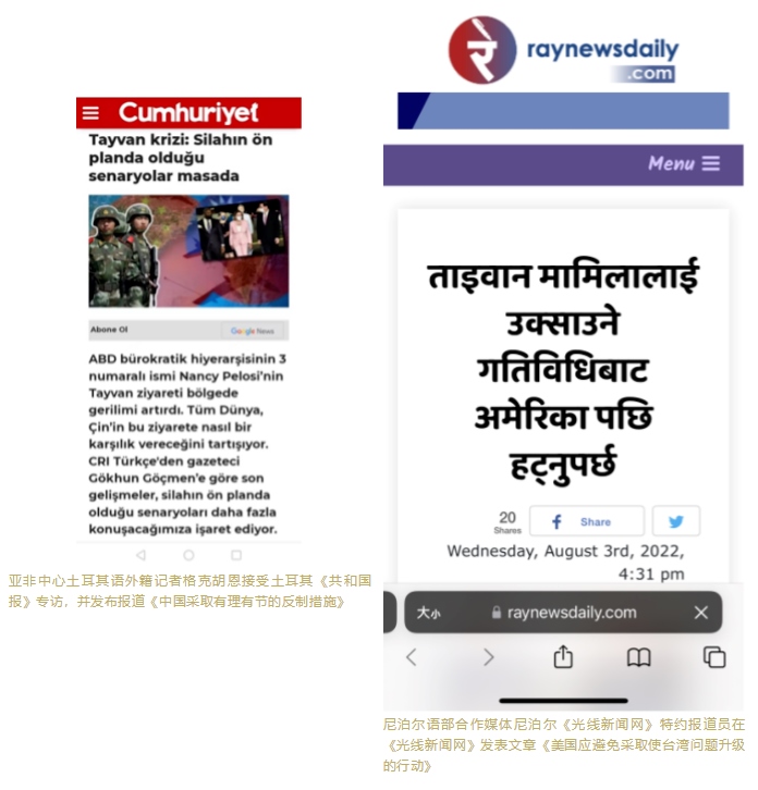 亞非中心土耳其、希伯來語、豪薩語、尼泊爾語、蒙古語等多語種主播、評論員和網(wǎng)紅積極在多家外媒發(fā)聲,接受了包括以色列電視臺、土耳其AHABER新聞臺、土耳其TGRT電視臺、土耳其新聞電視臺等多家國際媒體的采訪連線,同時(shí)多名外籍記者、海外特約評論員在尼日利亞《領(lǐng)導(dǎo)者報(bào)》網(wǎng)站、尼泊爾《光線新聞網(wǎng)》、肯尼亞《人民報(bào)》、蒙古國媒體SONIN.MN等對象國主流媒體發(fā)表評論及署名文章,對外闡釋中方立場和反制措施的合理性、正當(dāng)性,介紹臺灣問題歷史經(jīng)緯,揭批美國在臺灣問題上的背信棄義。