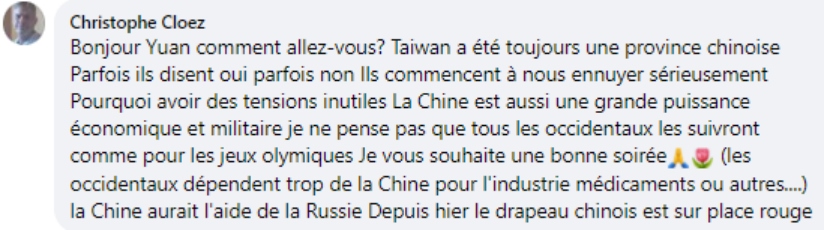 法語網(wǎng)友克羅茲:“臺灣始終是中國的一個(gè)省,美國人一會兒承認(rèn)一會兒又不承認(rèn),現(xiàn)在他們又開始搗亂。為什么要制造這種毫無意義的緊張氣氛呢?中國是一個(gè)經(jīng)濟(jì)和軍事大國,我不認(rèn)為西方會跟著美國走,就像之前的奧運(yùn)會一樣,西方國家太依賴于中國工業(yè)了。俄羅斯應(yīng)該是支持中國的吧,昨天紅場上方都飄著中國國旗?!?/p>