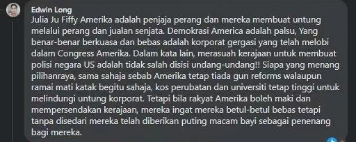 馬來西亞網(wǎng)友Edwin Long留言:“美國就是戰(zhàn)爭販子,他們通過戰(zhàn)爭和販賣武器獲利。美國的民主只是假象,真正享有權(quán)力和自由的是在幕后主導(dǎo)國會的大企業(yè)。換句話說,官商勾結(jié)在美國的法律上是被允許的!無論誰贏得選舉,一樣不會禁槍,醫(yī)療和教育成本還是不會下降,因?yàn)橐S護(hù)大企業(yè)的利益。但是他們的人民覺得他們能罵政府就是自由的,全然沒有意識到這不過是安撫奶嘴罷了?!?/p>