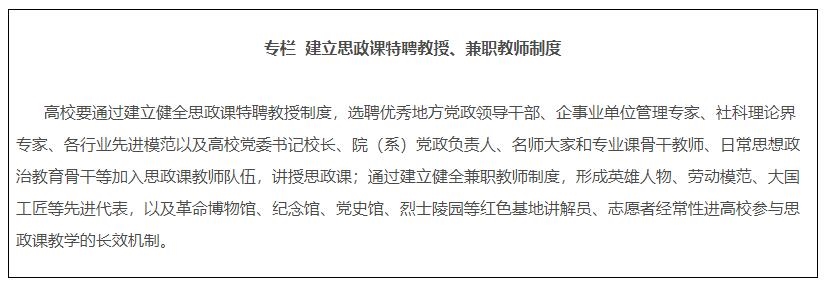 ??《方案》提出要建設專兼結(jié)合的師資隊伍,提高中小學專職思政課教師比例,各地教育部門要建立中小學思政課教師輪訓制度。各地各高校建立專門制度,常態(tài)化支持思政課骨干教師到各級宣傳、教育等黨政機關(guān)或基層掛職鍛煉、蹲點調(diào)研,相關(guān)經(jīng)歷納入評獎評優(yōu)、干部選聘體系,相關(guān)成果作為職稱評聘參考。