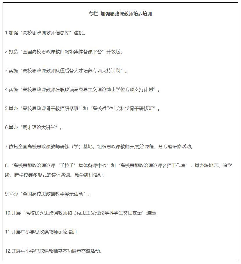 19.全面推進課程思政高質(zhì)量建設。教育部組建高等學校課程思政教學指導委員會,研制普通本科專業(yè)類課程思政教學指南,組織開展高校教師課程思政教學能力培訓,建設一批課程思政系列共享資源庫。建成一批課程思政示范高校,推出一批課程思政示范課程,選樹一批課程思政教學名師和團隊,建設一批高校課程思政教學研究示范中心。加強中小學學科德育建設。