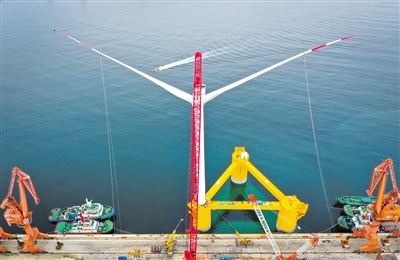 由中國船舶集團海裝風(fēng)電股份有限公司牽頭,聯(lián)合相關(guān)單位自主研制的“扶搖號”浮式風(fēng)電機組浮體平臺上配備6.2兆瓦抗臺型I類風(fēng)力發(fā)電機組,在深遠(yuǎn)海應(yīng)用場將依靠九個對稱分布的懸錨鏈系泊實現(xiàn)固定。圖為完成總裝的國內(nèi)首臺深遠(yuǎn)海浮式風(fēng)電裝備“扶搖號”在茂名廣港碼頭靜待拖航(無人機照片)。記者劉大偉攝