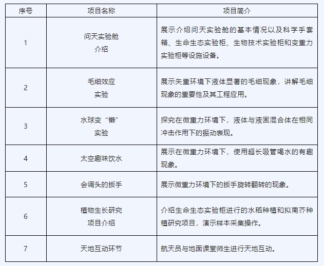 本次太空授課活動將繼續(xù)采取天地互動方式進行,3名航天員將在軌介紹展示中國空間站問天實驗艙工作生活場景,演示微重力環(huán)境下毛細效應實驗、水球變“懶”實驗、太空趣味飲水、會調(diào)頭的扳手以及植物生長研究項目介紹,并與地面課堂進行互動交流(授課內(nèi)容介紹附后),旨在傳播普及載人航天知識,激發(fā)廣大青少年對科學的興趣。