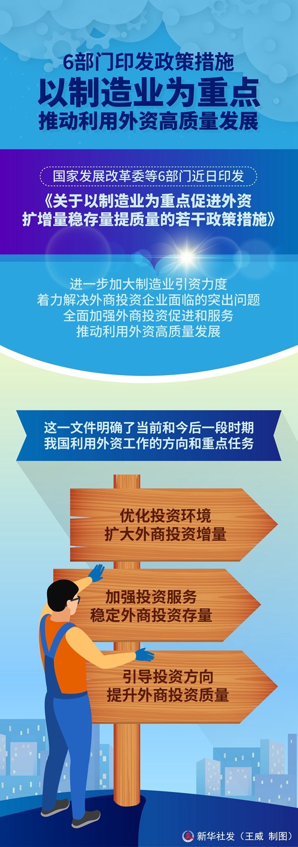 新華社北京10月25日電(記者安蓓)記者25日了解到,國家發(fā)展改革委等6部門近日印發(fā)《關于以制造業(yè)為重點促進外資擴增量穩(wěn)存量提質(zhì)量的若干政策措施》,進一步加大制造業(yè)引資力度,著力解決外商投資企業(yè)面臨的突出問題,全面加強外商投資促進和服務,推動利用外資高質(zhì)量發(fā)展。