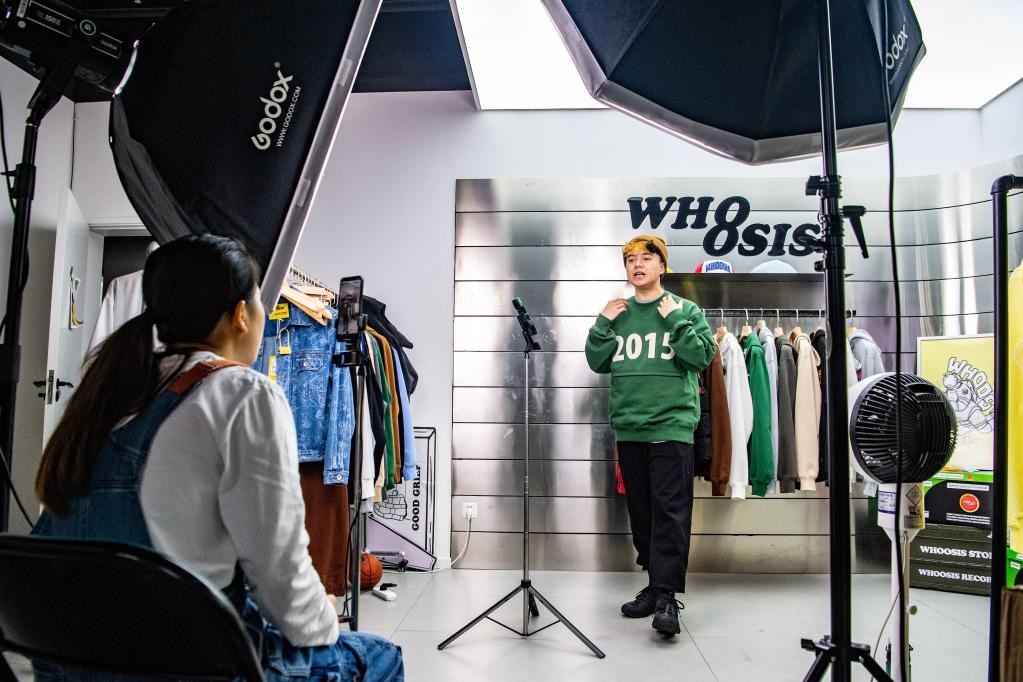 在重慶市渝中區(qū)由工業(yè)遺址改造成的“一廠影視園”一家國潮品牌公司內(nèi),創(chuàng)業(yè)者通過手機(jī)直播銷售商品(2022年9月27日攝)。新華社記者唐奕攝