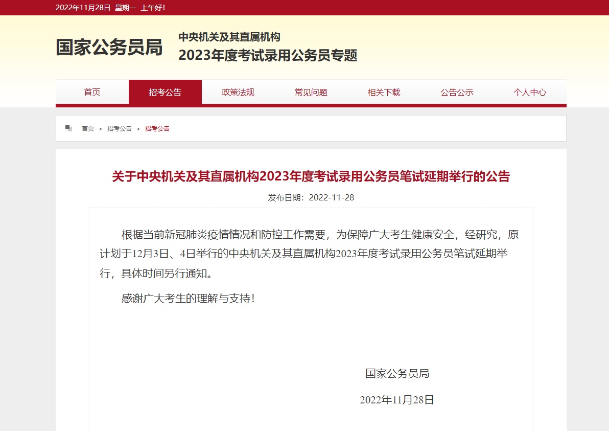??根據(jù)當(dāng)前新冠肺炎疫情情況和防控工作需要,為保障廣大考生健康安全,經(jīng)研究,原計劃于12月3日、4日舉行的中央機關(guān)及其直屬機構(gòu)2023年度考試錄用公務(wù)員筆試延期舉行,具體時間另行通知。