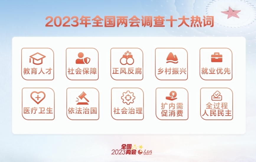 經(jīng)過網(wǎng)友投票,“教育人才”“社會保障”“正風(fēng)反腐”“鄉(xiāng)村振興”“就業(yè)優(yōu)先”“醫(yī)療衛(wèi)生”“依法治國”“社會治理”“擴內(nèi)需促消費”“全過程人民民主”入選十大熱詞。