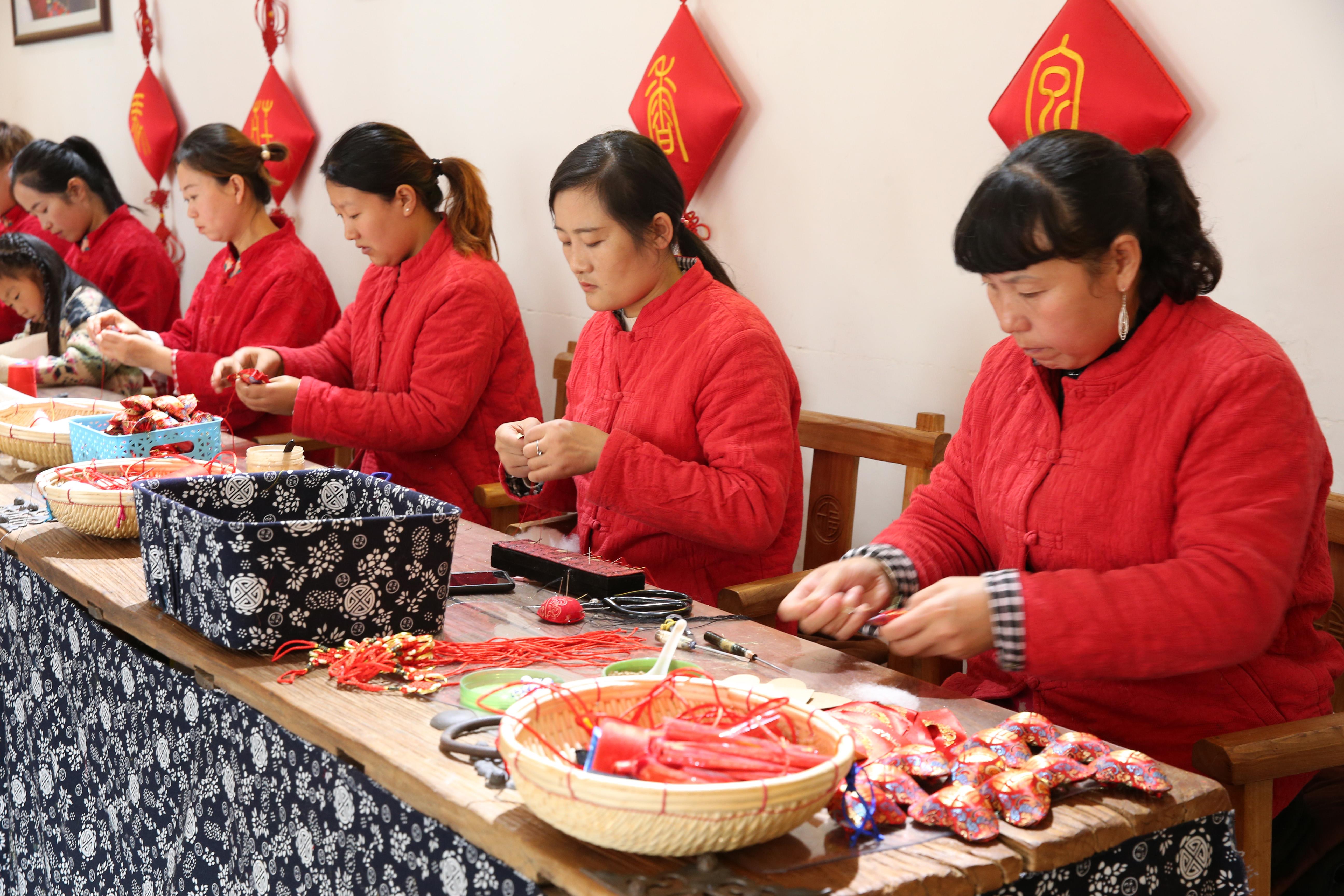 △在化屋村扶貧車間,隨處可見村民忙碌的身影。車間里有服裝刺繡、工藝品、蠟染等產(chǎn)品,銷量良好。