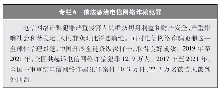 加大網(wǎng)絡犯罪懲治力度。隨著互聯(lián)網(wǎng)技術的快速發(fā)展,傳統(tǒng)犯罪加速向以互聯(lián)網(wǎng)為媒介的非接觸式犯罪轉變,電信網(wǎng)絡詐騙、網(wǎng)絡賭博、網(wǎng)絡淫穢色情等涉網(wǎng)違法犯罪多發(fā)。中國依法辦理新型網(wǎng)絡犯罪案件。連續(xù)多年開展“凈網(wǎng)行動”,嚴厲打擊群眾反映強烈的黑客攻擊破壞、侵犯公民個人信息等違法犯罪活動。持續(xù)推進“云劍”“斷卡”“斷流”“拔釘”等專項行動,打擊套路貸、校園貸、“以房養(yǎng)老”、“投資養(yǎng)老”等電信網(wǎng)絡詐騙犯罪,依法懲處為電信網(wǎng)絡詐騙犯罪團伙提供互聯(lián)網(wǎng)接入、域名注冊、服務器托管、移動互聯(lián)網(wǎng)應用程序制作開發(fā)、網(wǎng)絡支付、引流推廣等服務支撐的黑灰產(chǎn)業(yè)。完善國家反詐大數(shù)據(jù)平臺和反詐移動互聯(lián)網(wǎng)應用程序,建設國家涉詐黑樣本庫,完善快速止付凍結機制、涉詐資金返還機制。堅決打擊網(wǎng)絡賭博犯罪行為,從嚴治理網(wǎng)絡淫穢色情。網(wǎng)絡犯罪治理工作取得明顯成效,人民群眾安全感有效提升,社會更加和諧穩(wěn)定。