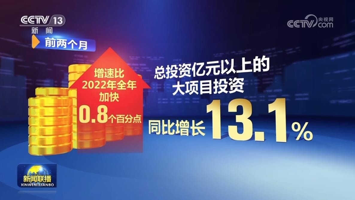 前兩個(gè)月,全國固定資產(chǎn)投資同比增長5.5%,增速比2022年全年明顯加快,其中,總投資億元以上的大項(xiàng)目投資同比增長13.1%,增速比2022年全年加快0.8個(gè)百分點(diǎn)。