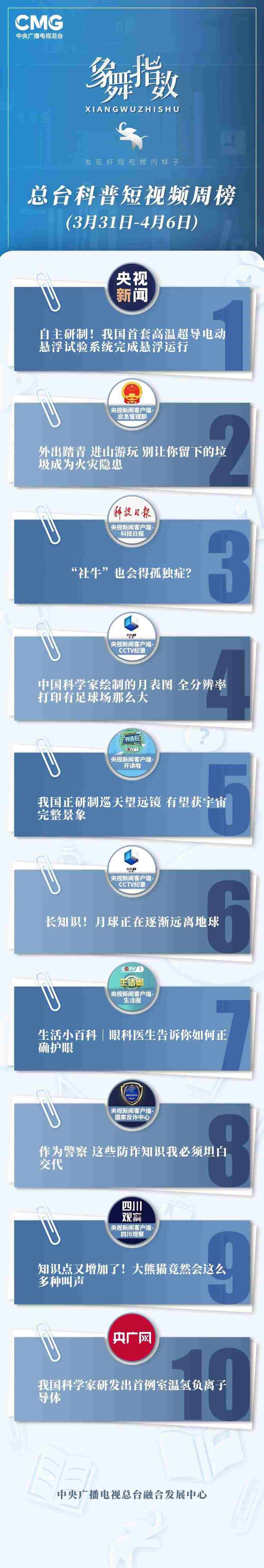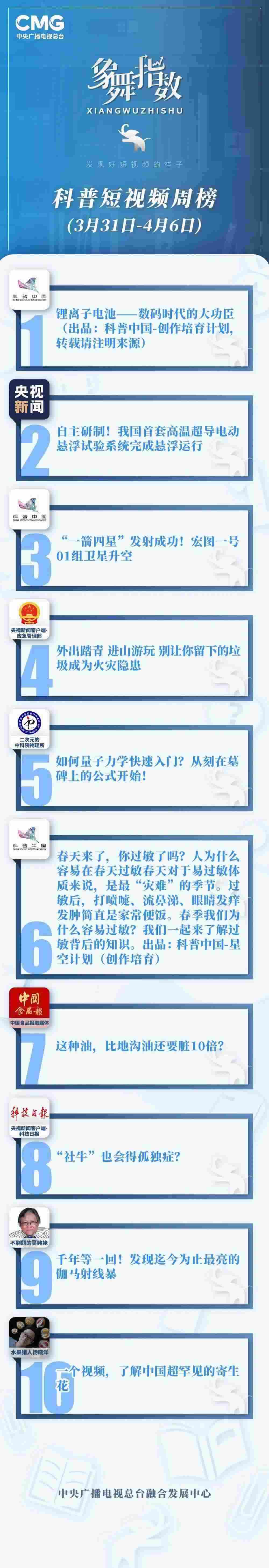 中央廣播電視總臺“象舞指數(shù)”評議品牌,推出科普短視頻周榜、總臺科普短視頻周榜。在2023年3月31日-4月6日,值得注目的內(nèi)容有: