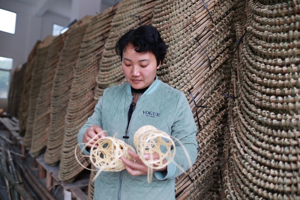 在貴州省赤水市竹城竹業(yè)加工坊,赤水竹編傳承人唐小容在編織竹制品(2022年11月29日攝)。新華社記者 劉續(xù) 攝