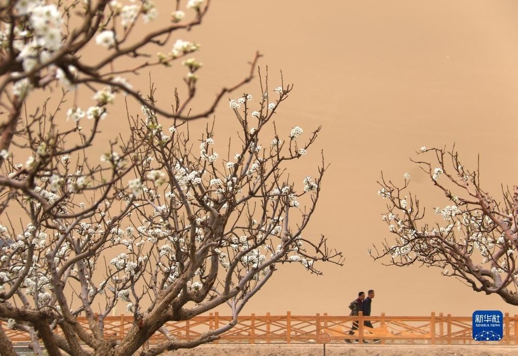 近日,甘肅省敦煌市鳴沙山月牙泉景區(qū)內(nèi)的桃花、梨花、丁香花競(jìng)相綻放,別有一番韻味。新華社發(fā)(張曉亮攝)
