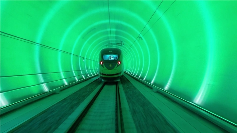 2023年4月9日,云南西雙版納,航拍中老鐵路友誼隧道,隧道內(nèi)各種燈光裝飾,隧道外墻畫展現(xiàn)文化特色。視覺中國