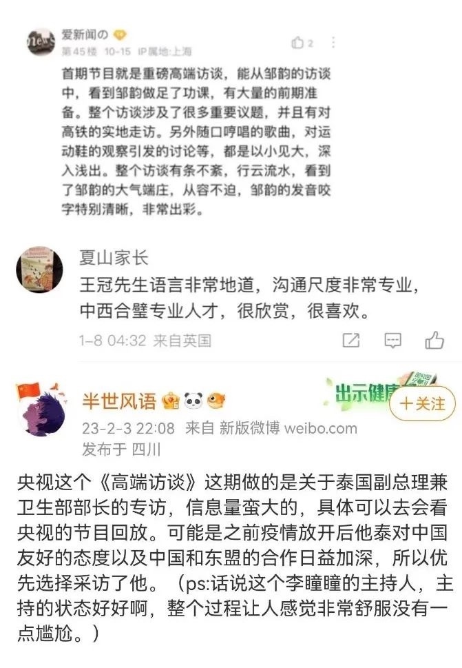 專訪泰國(guó)副總理阿努廷時(shí),主持人李曈曈提到,他去機(jī)場(chǎng)迎接中國(guó)游客的新聞,在中國(guó)社交媒體有4.9億閱讀量。阿努廷感動(dòng)地說,他當(dāng)時(shí)說的都是肺腑之言,沒想到會(huì)有這么多人看到這條新聞。