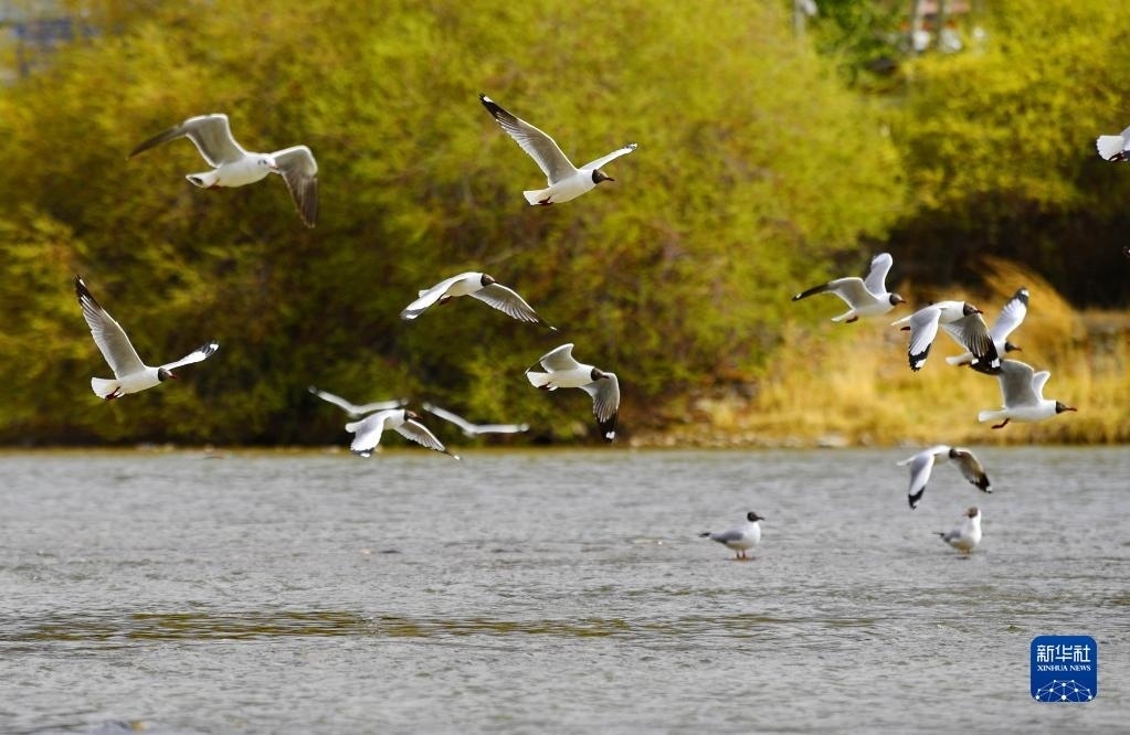 棕頭鷗盤旋在拉薩河上(4月16日攝)。