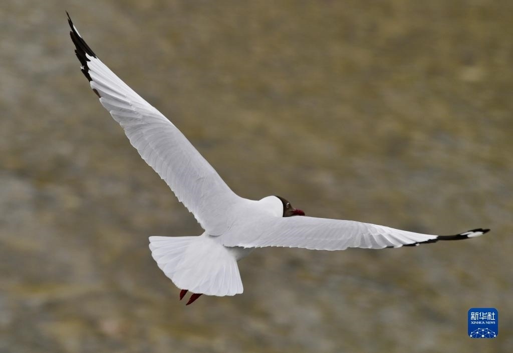 棕頭鷗在拉薩河上空飛翔(4月16日攝)。