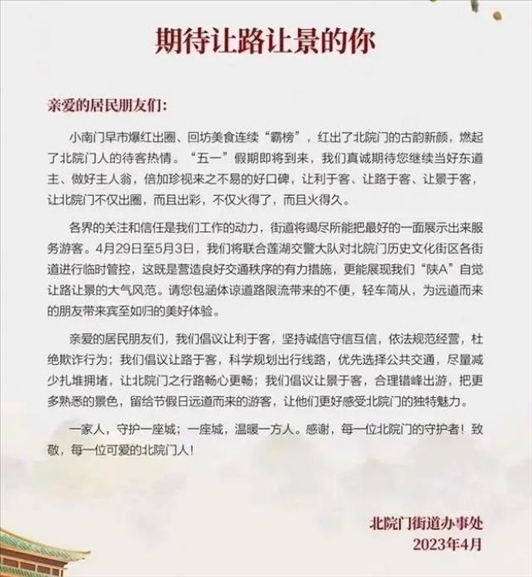 ·西安一街道辦回應(yīng)“倡議五一期間陜A讓路讓景”:想讓外地游客有更好體驗,并非強制播報文章。