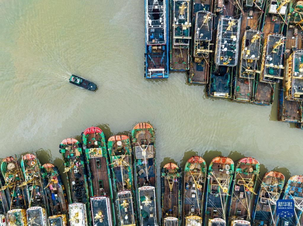 當日,在浙江省溫嶺市石塘鎮(zhèn),漁船陸續(xù)進港??浚蛹磳⒌絹淼男轁O期。新華社發(fā)(徐偉杰攝)