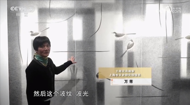 工筆花鳥畫家 上海市文史研究館館員 萬芾:我們看到水泥柱子嘛,方的,這個波紋我是用山水畫里的披麻皴的皴法,形成水光瀲滟的效果,畫面也是用了一個比較抽象的點(diǎn)線面的元素來處理的,追求還是中國傳統(tǒng)繪畫里的氣韻生動,只是整個畫面第一感覺的形式讓人現(xiàn)代的感覺。