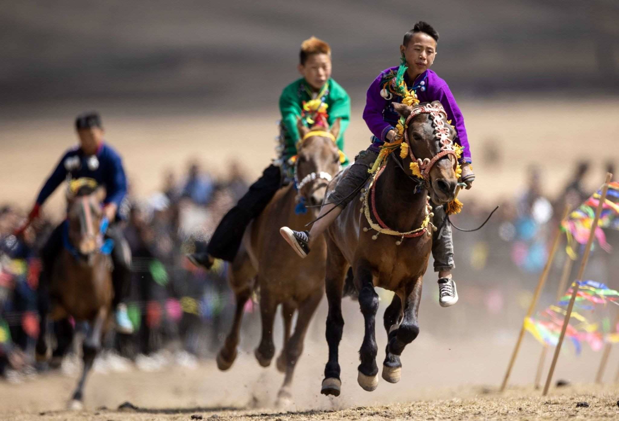 2023年4月25日,四川涼山,普格縣黎安鄉(xiāng)??诹鹤樱瑐鹘y(tǒng)的彝族賽馬比賽拉來帷幕。視覺中國