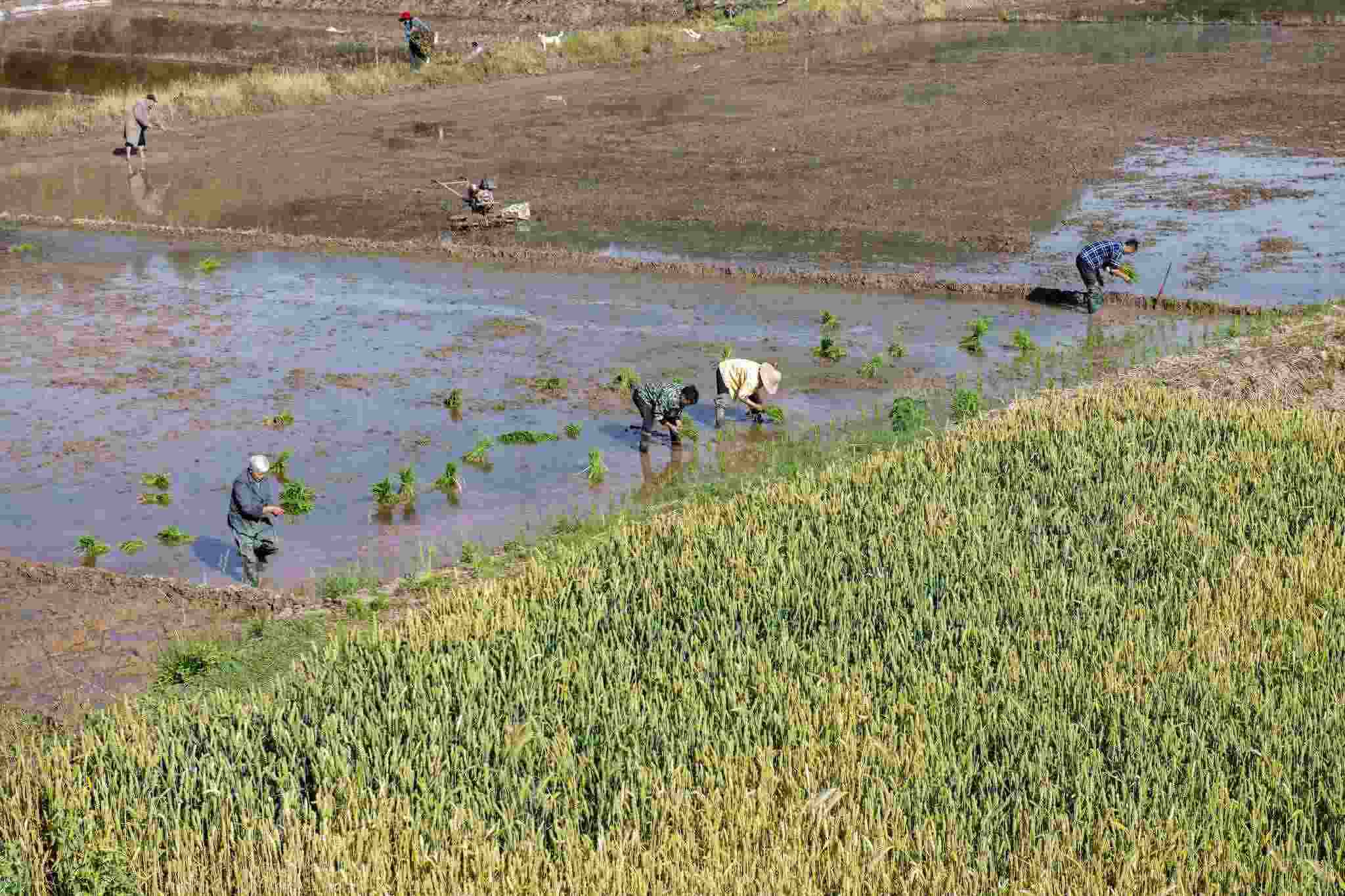 2023年4月30日,四川閬中,暮春時節(jié),村民在囤水田栽插早稻,處處可見搶抓農(nóng)時的忙碌身影。視覺中國