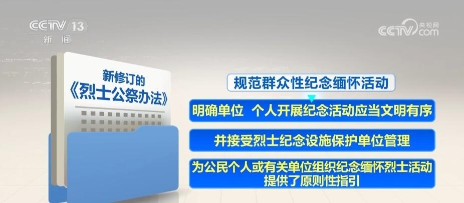 新修訂的《烈士公祭辦法》自5月1日起施行。其中,強調(diào)發(fā)揮公祭活動對青少年的教育作用,要求各級各類學(xué)校組織學(xué)生以適當(dāng)方式參加烈士公祭,加強愛國主義、集體主義、社會主義教育。規(guī)范群眾性紀(jì)念緬懷活動,明確單位、個人開展紀(jì)念活動應(yīng)當(dāng)文明有序,并接受烈士紀(jì)念設(shè)施保護單位管理,為公民個人或有關(guān)單位組織紀(jì)念緬懷烈士活動提供了原則性指引。