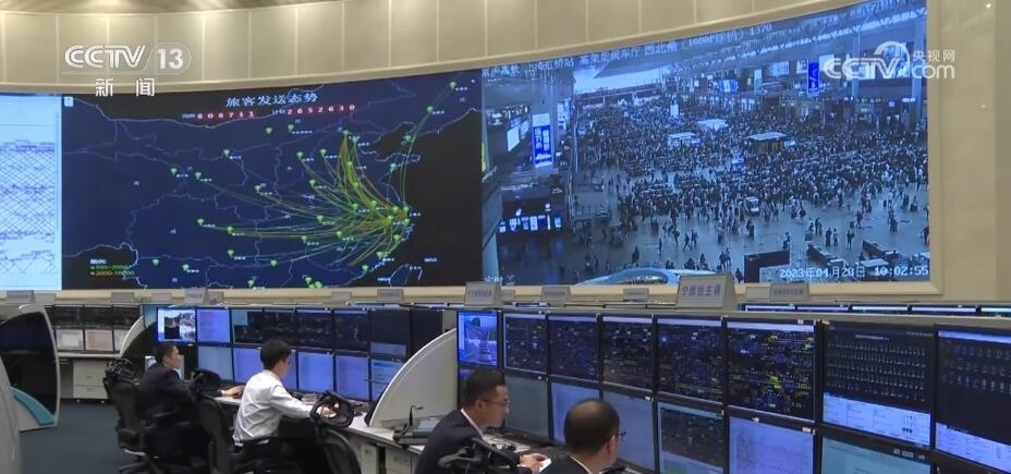 總臺央視記者 鄭連凱:在調(diào)度大廳的屏幕上,我們可以實時看到包括剛剛采訪的虹橋站在內(nèi),整個長三角地區(qū)740多座車站的客流情況,以及13000多公里鐵路線上列車的運行狀態(tài)。而這張圖顯示的是從長三角連通全國各地的干線鐵路的繁忙程度,其中紅色的京滬、滬漢榮、滬昆代表著最繁忙,這里的工作人員可以根據(jù)客票需求隨時調(diào)度,增開臨客列車。
