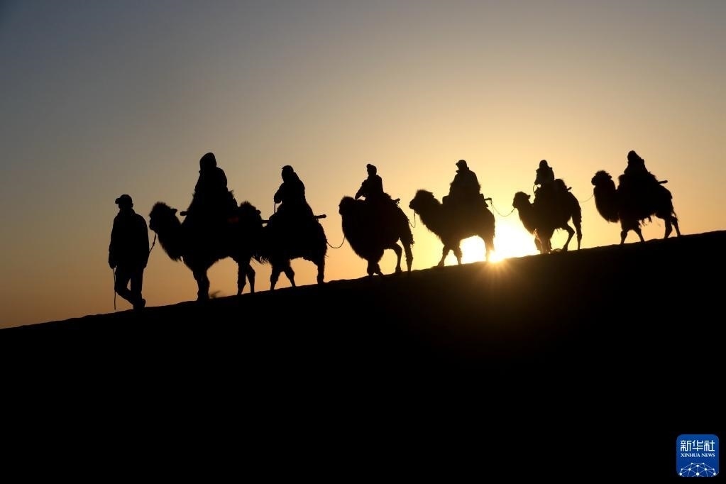 金色的鳴沙山上響起陣陣駝鈴聲,編號“414”的領頭駱駝和51歲的牽駝人曹文華一起帶領著駝隊,馱著游客,朝連綿起伏的沙丘深處走去。