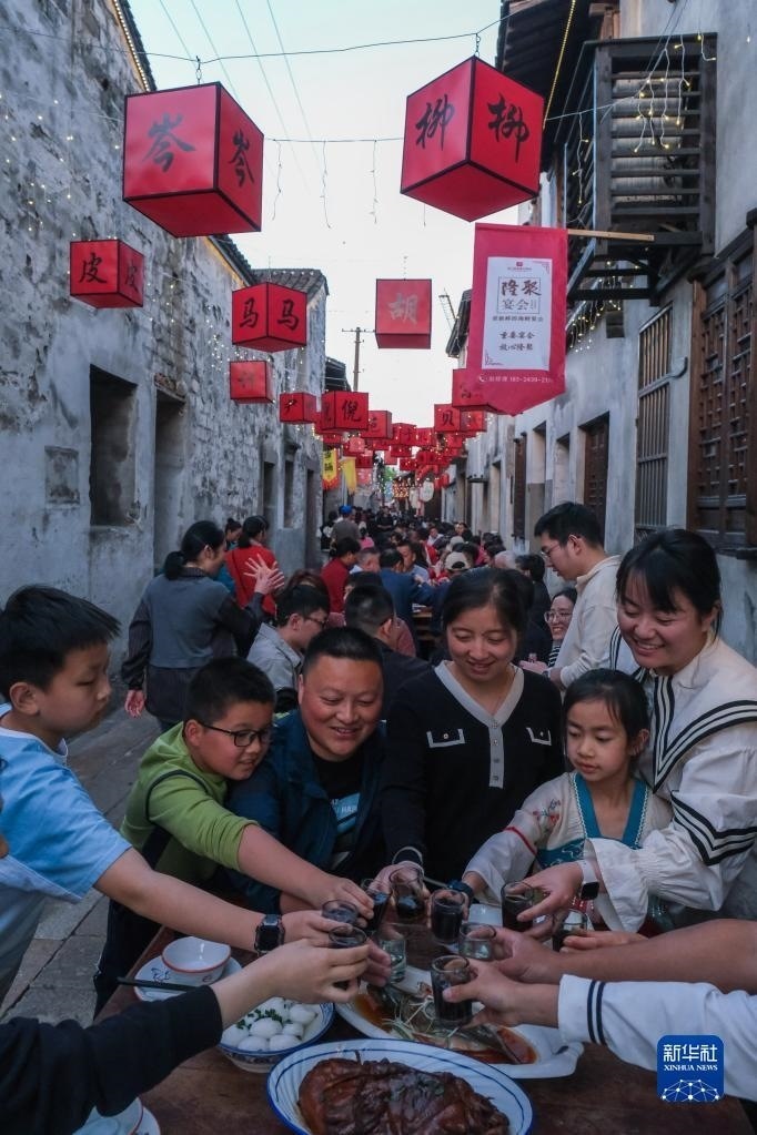5月1日,在浙江嘉興桐鄉(xiāng)市崇福鎮(zhèn)運(yùn)河文化歷史街區(qū)的橫街上,游客參加古鎮(zhèn)特色長街宴。