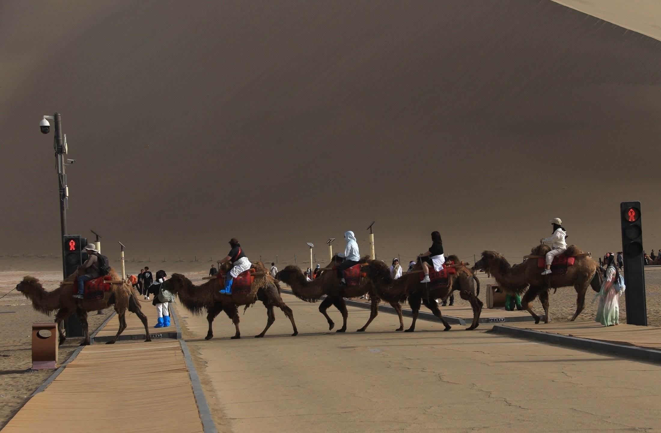 甘肅酒泉:月牙泉景區(qū)內(nèi)設(shè)置駱駝紅綠燈