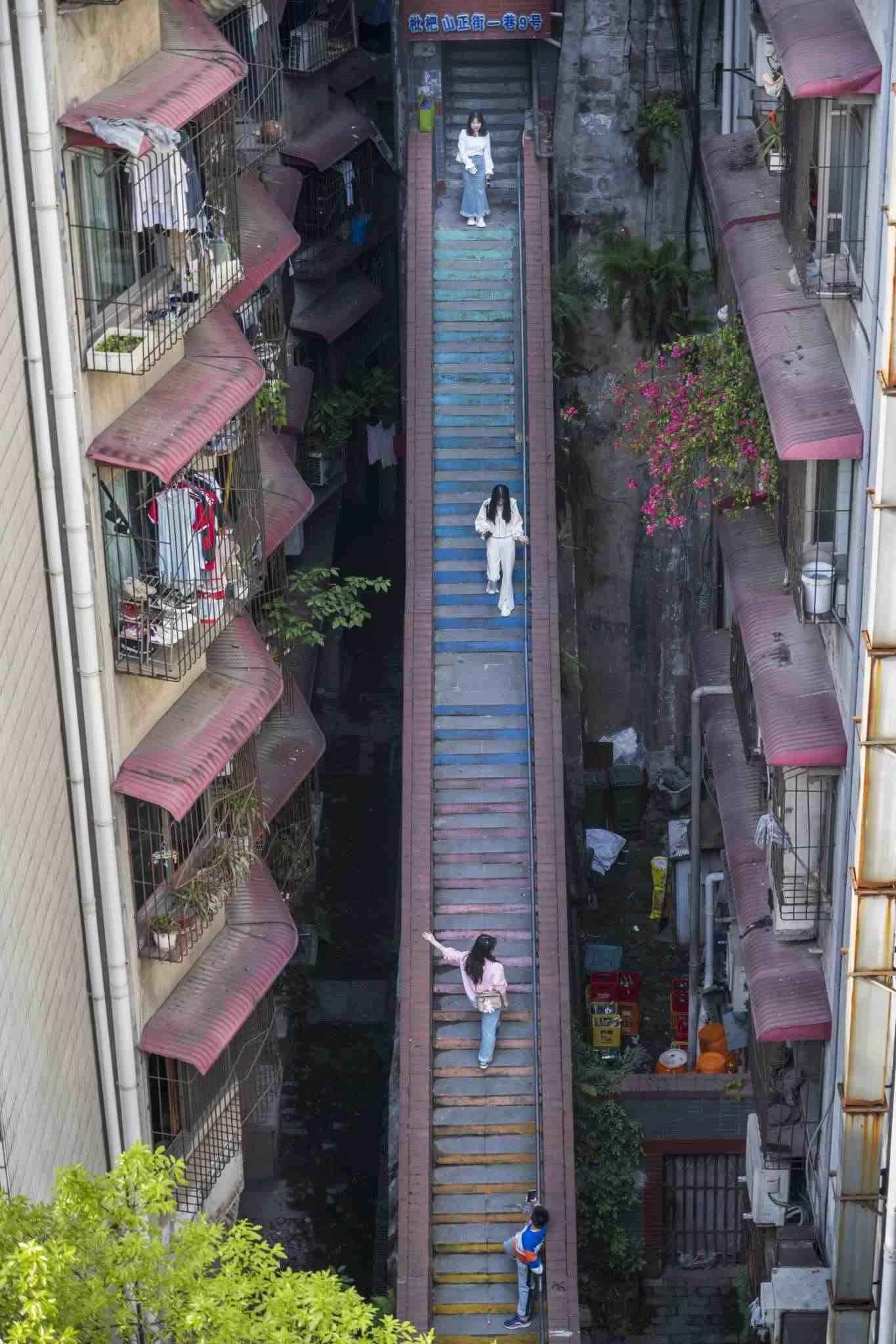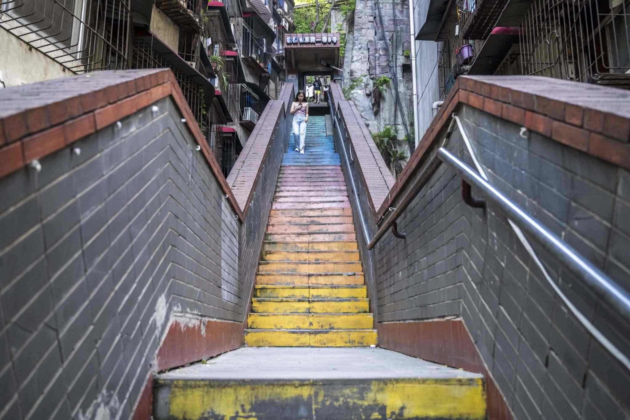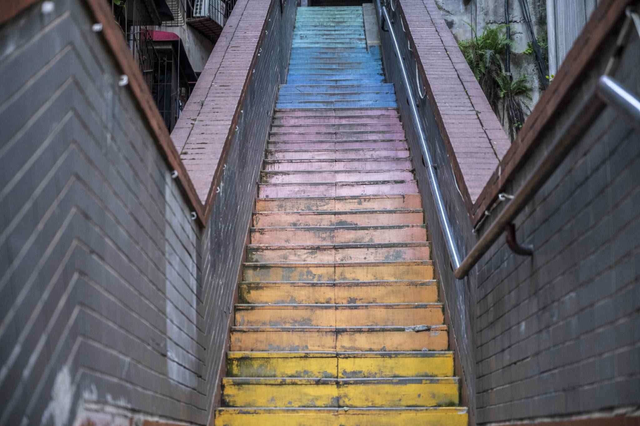 “彩虹樓梯”位于重慶渝中區(qū)枇杷山正街的居民樓間,高約20米,共有50多級(jí)階梯,極具山城特色。經(jīng)過多種顏色涂鴉后,吸引不少市民和攝影愛好者“打卡”。視覺中國