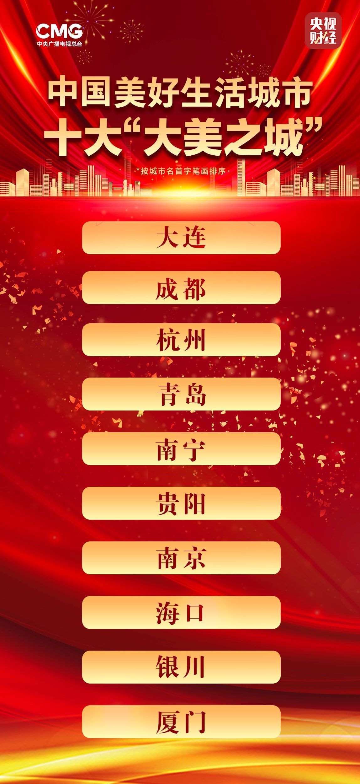 大連、成都、杭州、青島、南寧、貴陽、南京、海口、銀川、廈門上榜十大“大美之城”(城市均以首字筆畫排序)。