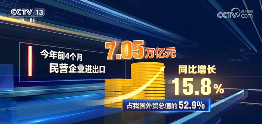 海關(guān)統(tǒng)計(jì)顯示,今年前4個(gè)月,民營企業(yè)進(jìn)出口7.05萬億元,同比增長15.8%,占我國外貿(mào)總值的52.9%。
