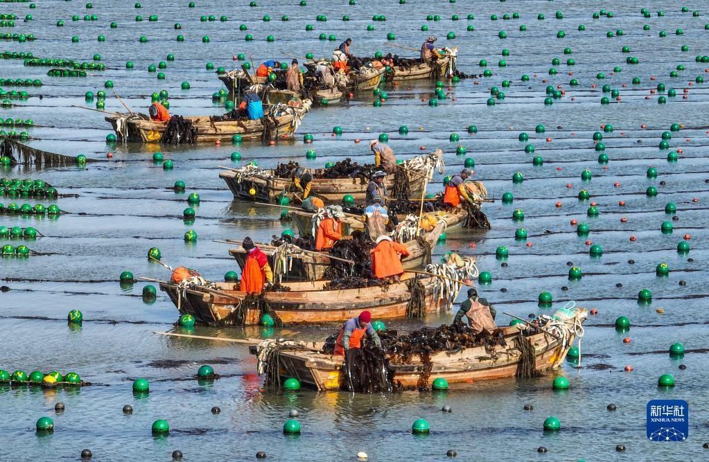 5月8日,在山東省榮成市愛倫灣海域海帶養(yǎng)殖區(qū),漁民采收海帶(無人機照片)。
