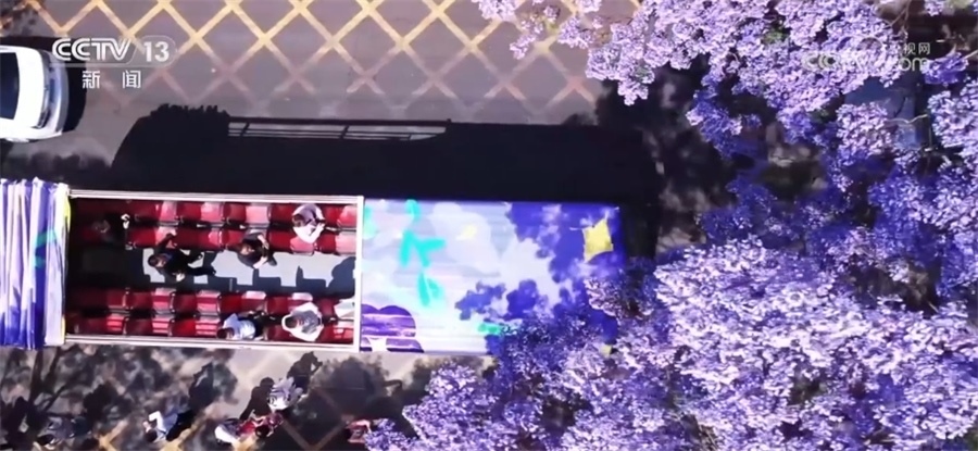 總臺記者 郭琳潔:我現(xiàn)在是在昆明的教場中路,5月上旬,道路兩側(cè)的藍花楹競相綻放,將這條1.4公里長的道路裝扮成一條紫色長廊。