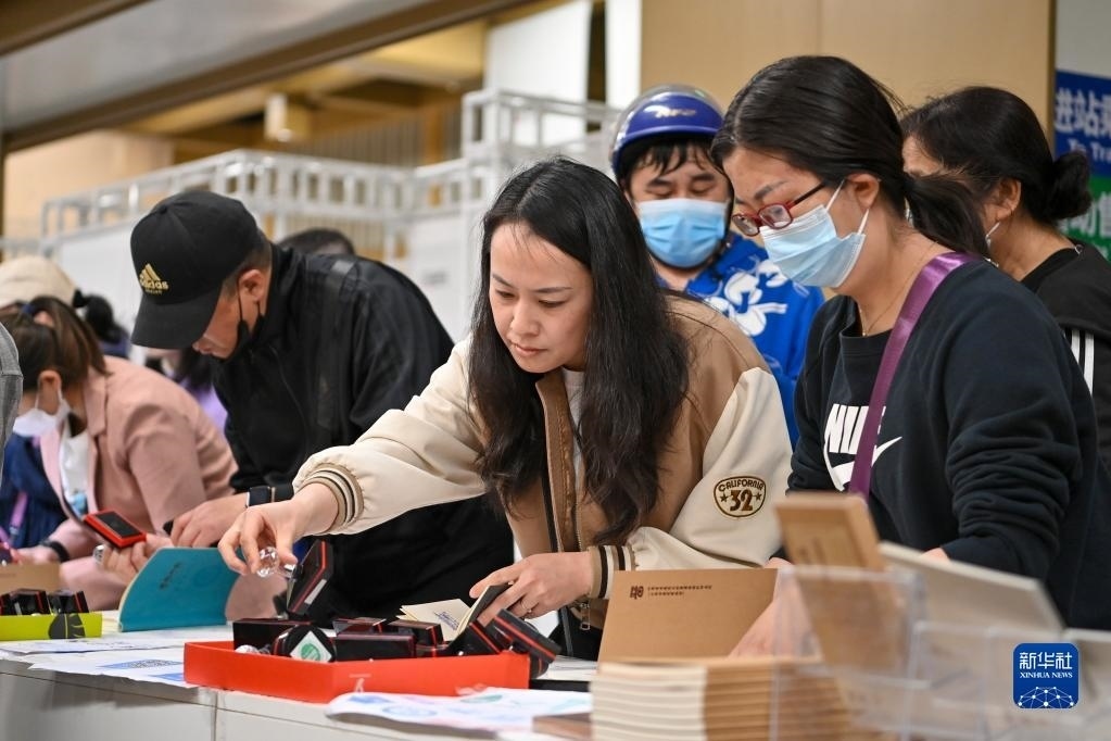 5月9日,在太原地鐵2號(hào)線(xiàn)大南門(mén)站,市民在第三屆“印記太原”文化創(chuàng)意設(shè)計(jì)展上體驗(yàn)古城游集章活動(dòng)。