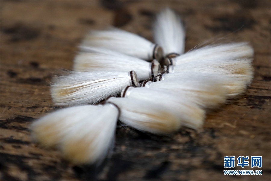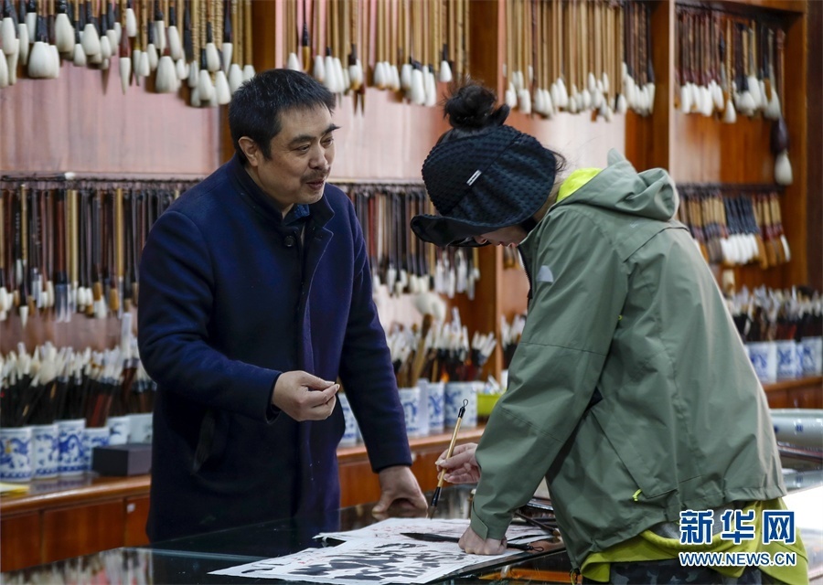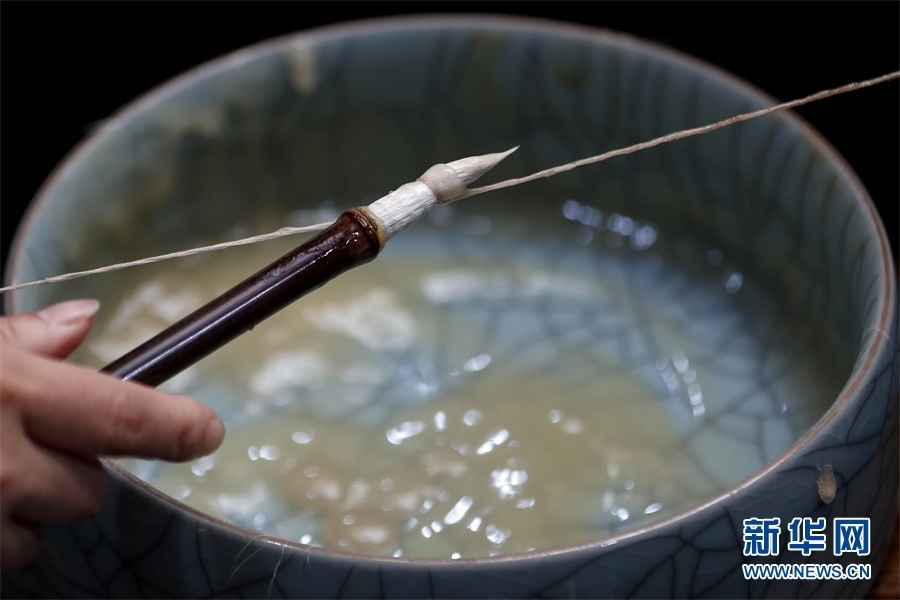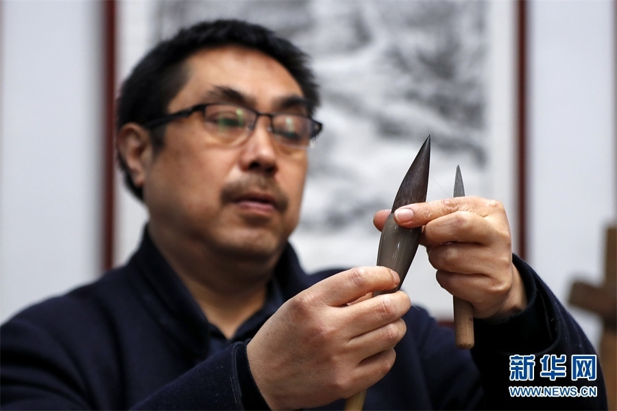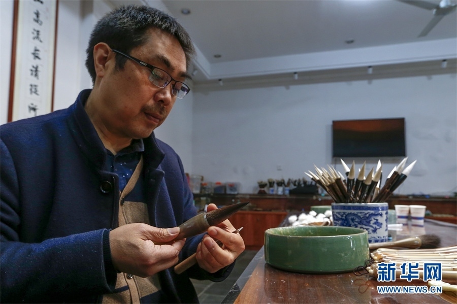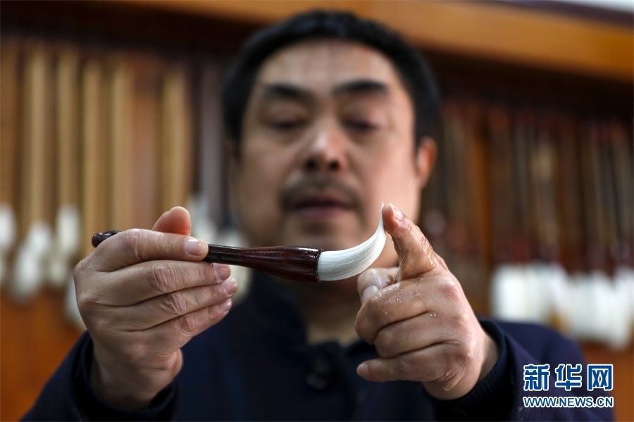 一支好的徽筆,不僅要保留傳統(tǒng)工藝,且要在原基礎(chǔ)上不斷創(chuàng)新、改良。楊文尤其重視書畫家對筆的使用反饋:“因為他們對用筆最挑剔,而且現(xiàn)代書畫家創(chuàng)作方式和作品不斷創(chuàng)新,對毛筆也有新的要求,他們提出的要求我總是盡力去滿足,也使得制筆技藝進(jìn)一步得到了提高。” 新華網(wǎng)發(fā)(施亞磊 攝)