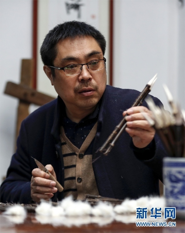 近日,楊文正在制作毛筆。