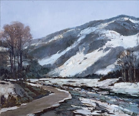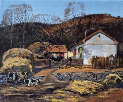 《激戰(zhàn)松骨峰》描繪的是抗美援朝戰(zhàn)爭中,中國人民志愿軍與美軍激烈廝殺的悲壯場面。作者從動態(tài)型的構圖與形象表層,把戰(zhàn)爭集團之間的搏殺以濃重的筆調(diào)展現(xiàn)開來,表現(xiàn)了中國人民志愿軍英勇頑強、熱愛自由和勇于犧牲的精神,展示了歷史的悲劇性沖突。作者從沉甸甸的歷史中找到戰(zhàn)爭中最慘烈、最殘酷、最能表現(xiàn)人物悲劇性命運的瞬間,用現(xiàn)實主義的創(chuàng)作手法,扎實、生動地塑造了一個又一個志愿軍勇士的形象。硝煙籠罩著戰(zhàn)場,鮮血與白雪融合成冰,敵我雙方,犬牙交錯,生死搏殺。同時,也使我們感受到戰(zhàn)爭的殘酷與生命的脆弱。作者處理宏大的戰(zhàn)爭場面獨具匠心:陽光透過硝煙,有節(jié)奏地營造出戰(zhàn)場的空間;雪地上被間隔的藍色陰影,反襯出黃褐色的主調(diào)。作品對細部進行了恰如其分的刻畫,但又不失對整體宏觀的把握,厚重的色彩中透出熱情,樸拙的筆觸映著畫家的激動。