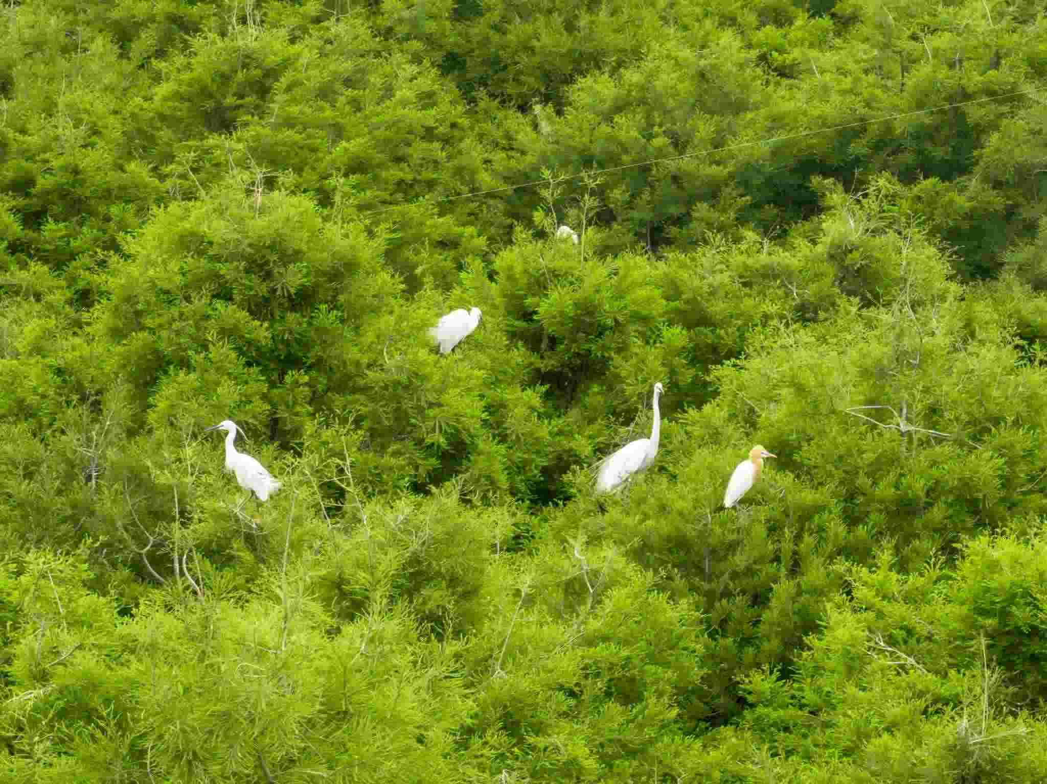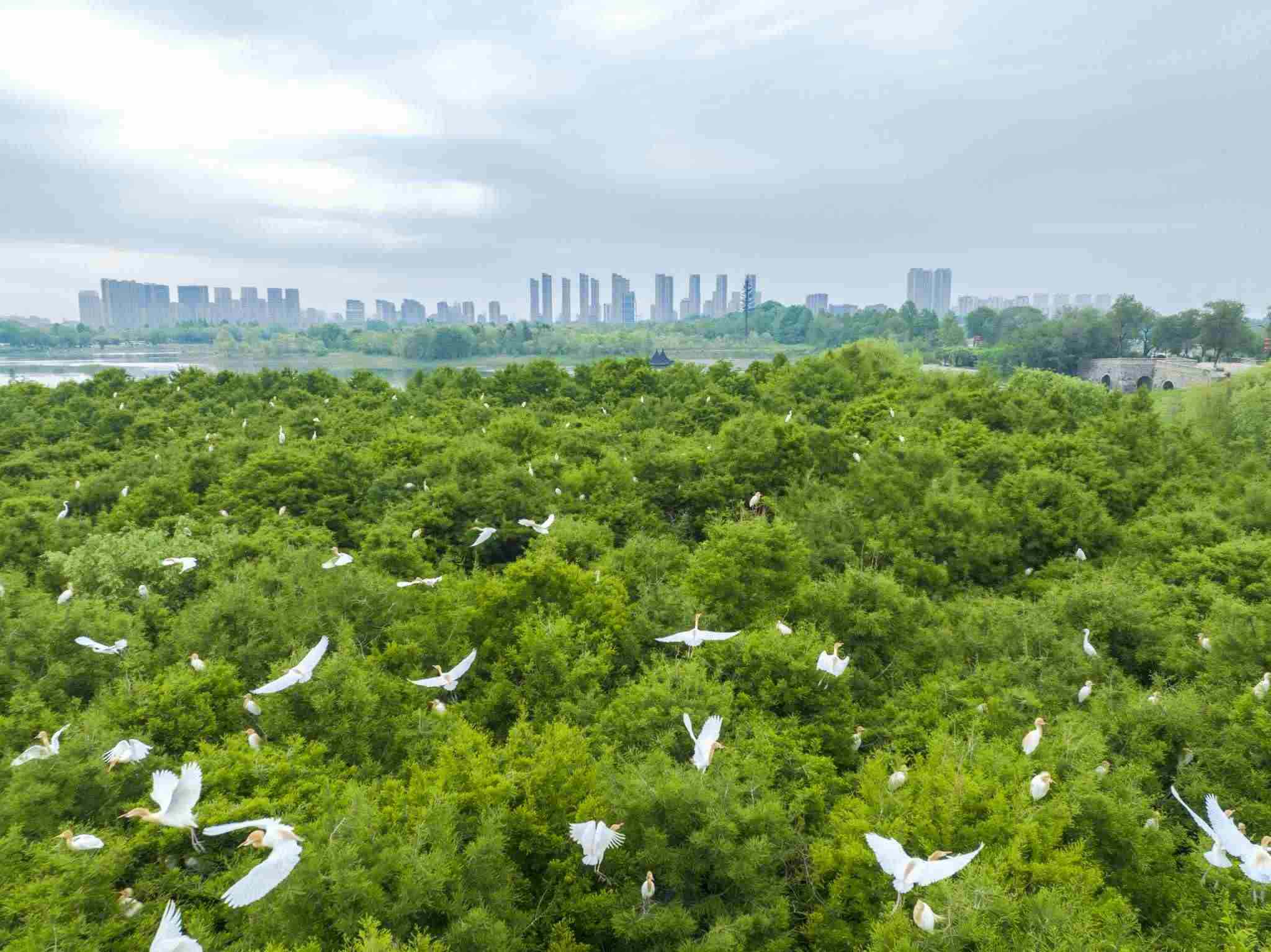 2023年5月11日,江蘇連云港,東??h西雙湖濕地公園,上千只鷺鳥前來?xiàng)⒎毖?。視覺中國